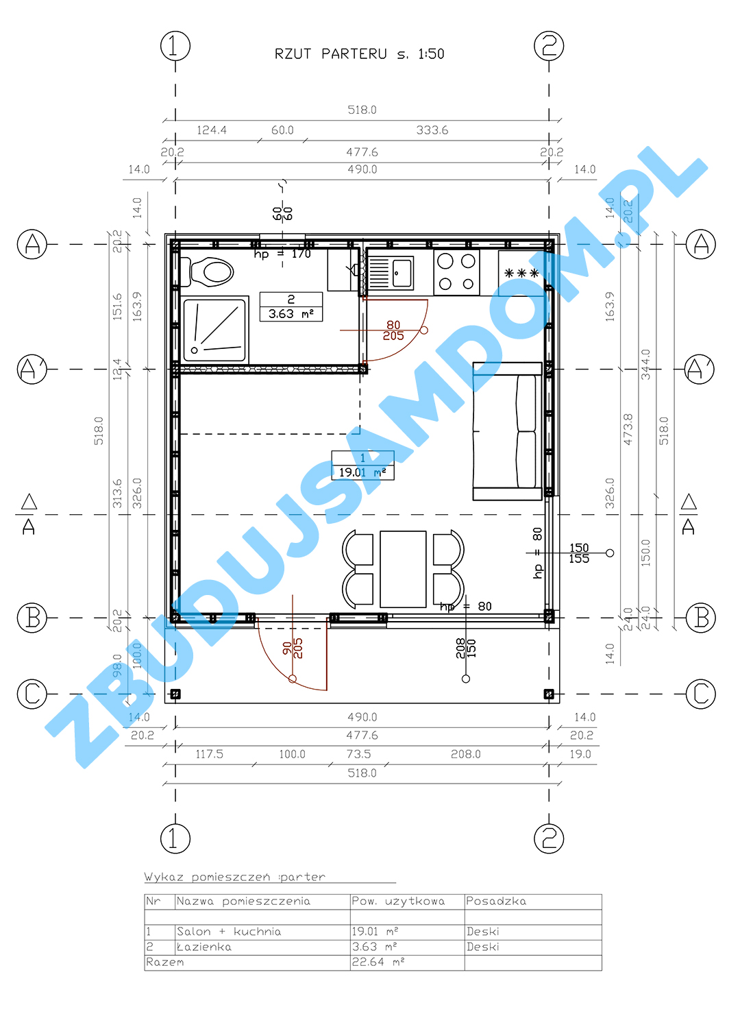 Powierzchnia użytkowa parteru: 22,64m2