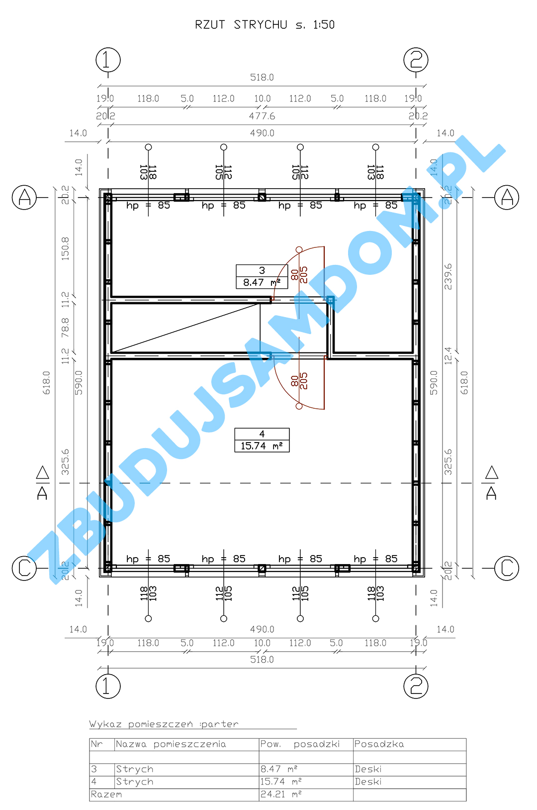 Powierzchnia strychu nieużytkowego (antresola): 24,21m2