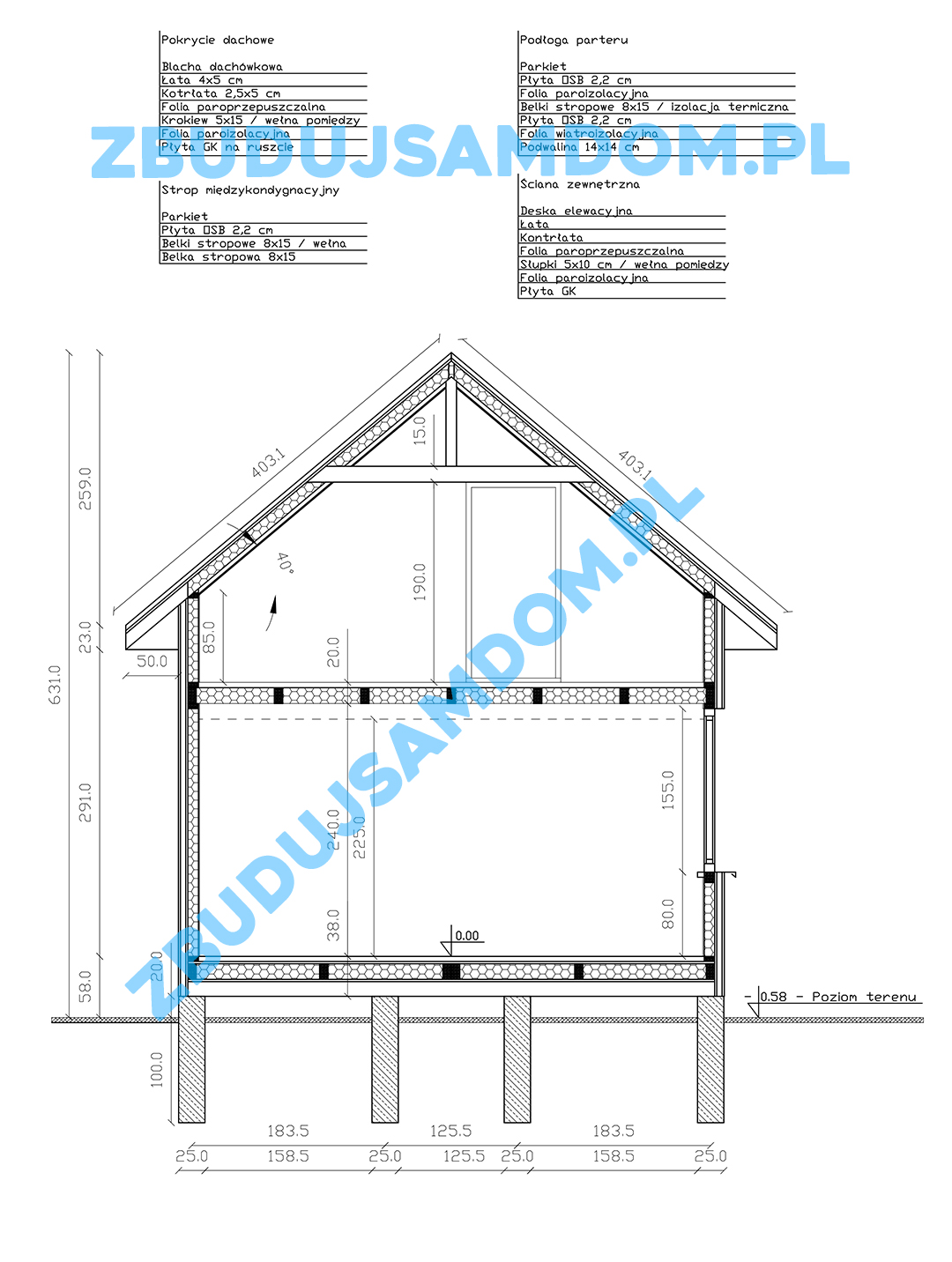 Technologia szkieletowa. Ściany w budynku zaprojektowano jako konstrukcję szkieletową, z wypełnieniem wełną mineralną. Główne elementy konstrukcyjne to słupy 10×10 cm w narożach budynku oraz jako podpory stropu. Szkielet ścian stanowić będą belki 5×10 cm na podwalinie.