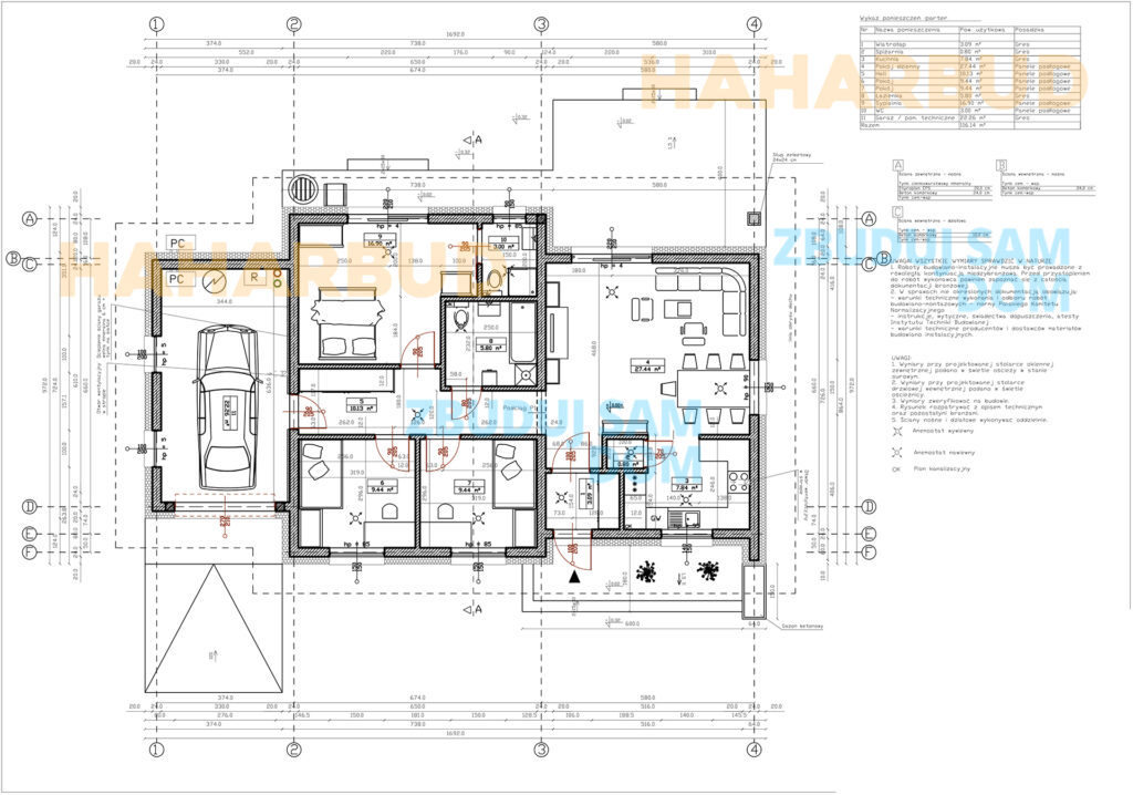 Projekt jest zgodny z wszystkimi aktualnymi przepisami prawa budowlanego, zawiera: